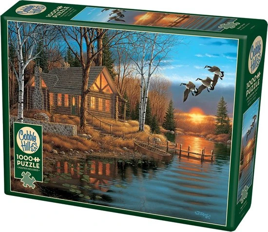 De perfecte rustplaats is een hut aan een meer bij zonsondergang. Puzzel van Cobble Hill met 1000 stukjes