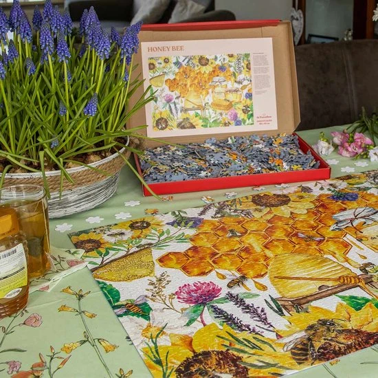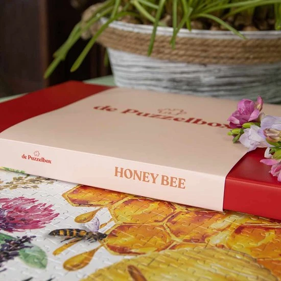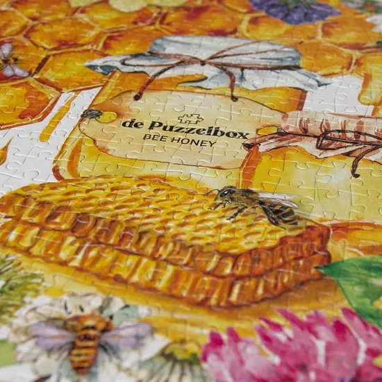 De Puzzelbox ‘Honey Bee’ bevat een unieke 1000-stukjes legpuzzel van maar liefst 68 x 48 cm.