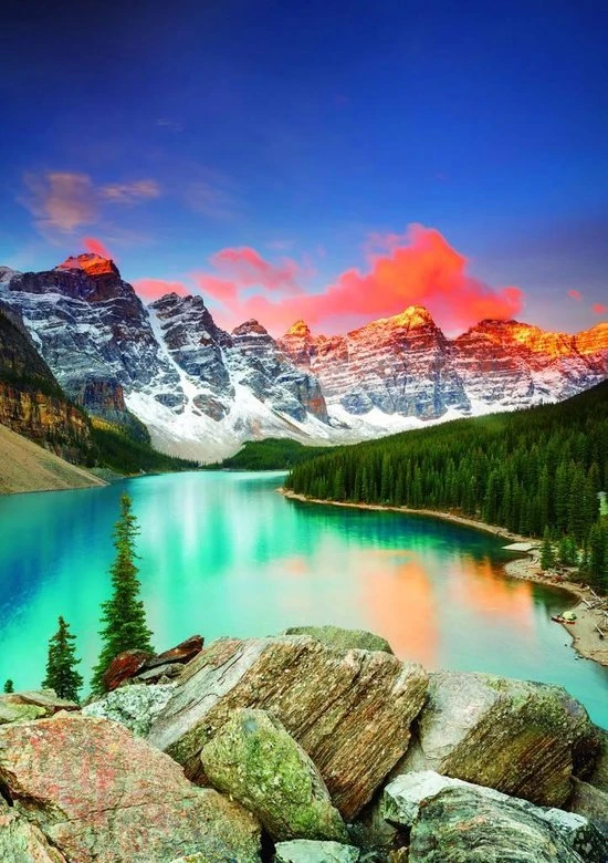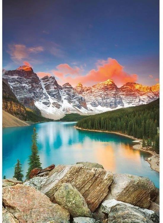 Puzzel van 1000 stukjes van het bergmeer Lac Moraine in het National Park Banff in Canada.