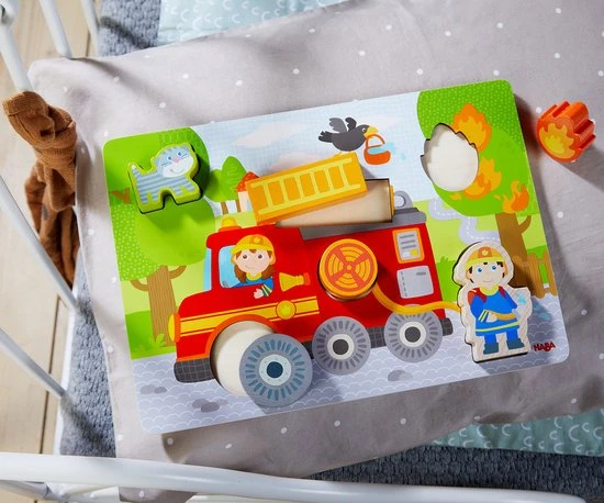 Ta-tu, ta-tu, daar komt de brandweer! In de ene boom zit een kat vast, een andere boom vuur gevat. Wie kan goed puzzelen en de brandweer helpen? De grote puzzelstukken zijn gemakkelijk te grijpen voor kleine kinderhandjes. Een liefdevol vormgegeven houten puzzel, die leuk is en de fijne motoriek bevordert.