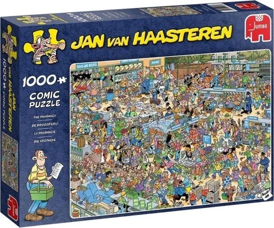 Jan van Haasteren De Drogisterij Puzzel 1000 Stukjes is een van de nieuwe puzzels van Jan van Haasteren. In deze Drogisterij verloopt niet alles even soepel. De Drogisterij van Jan van Haasteren is een puzzel met 1000 stukjes voor de echte Jan van Haasteren fans! Zodra je Jan van Haasteren de Drogisterij met 1000 Stukjes begint te puzzelen stuit je op het ene na het andere hilarische tafereel.