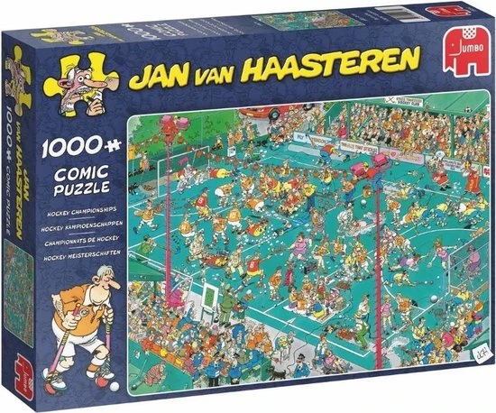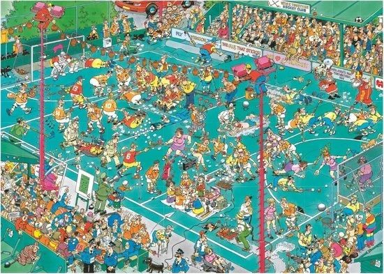 Tijdens Jan van Haasteren Hockey Kampioenschappen Puzzel 1000 Stukjes gaat echt alles mis! Niet alleen op het veld, maar ook in het publiek zijn er vele grappige details te zien. Op deze legpuzzel van Jan van Haasteren Hockey Kampioenschappen met 1000 Stukjes is het totale chaos! Tijdens het puzzelen van Jan van Haasteren Hockey Kampioenschappen Puzzel met 1000 Stukjes kom je steeds meer grappige details en taferelen tegen.