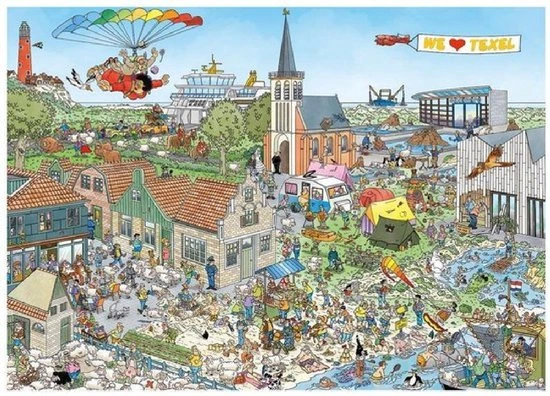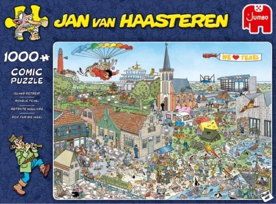 Een schitterende Jan van Haasteren puzzel van het Nederlandse eiland Texel met 1000 stukjes. Deze puzzel Rondje Texel laat vele bezienswaardigheden van Texel zien op een komische manier. Het puzzelen van deze editie is daarom ook harstikke leuk als je deze plekken herkent. Let op het is harstikke druk op Texel, dus hopelijk lukt het jou om alle figuurtjes een plekje te geven.