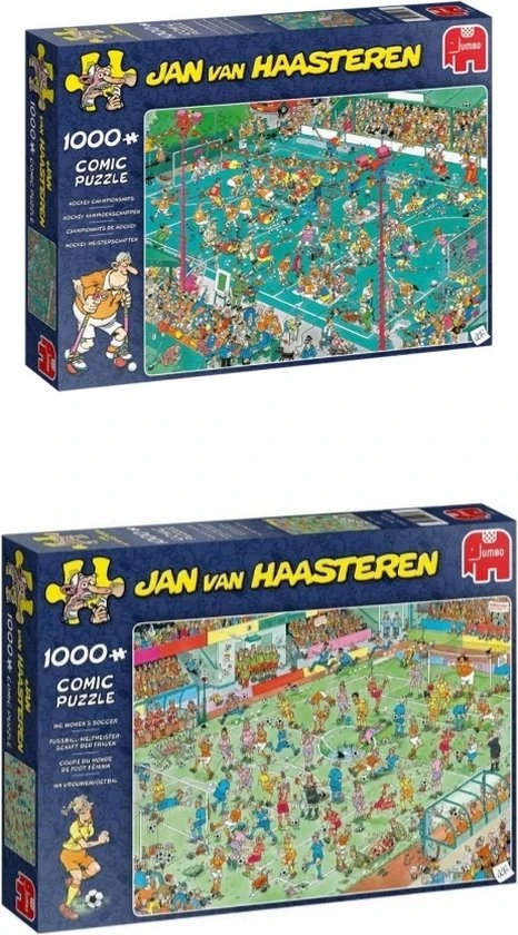 Jan van Haasteren WK Vrouwenvoetbal Puzzel 1000 Stukjes. Jan van Haasteren tekent al decennia lang humoristische platen die je steeds weer verrassen en laten lachen. De echte fans kennen de specifieke kenmerken van Jan van Haasteren en zoeken in elke puzzel direct naar de haaienvin, Sinterklaas, de handjes, het kunstgebit en Jan’s zelfportret. Jumbo heeft tientallen Jan van Haasteren puzzels in de collectie van 54 tot maar liefst 5.000 puzzelstukjes.