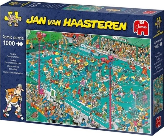 Tijdens Jan van Haasteren Hockey Kampioenschappen Puzzel 1000 Stukjes gaat echt alles mis! Niet alleen op het veld, maar ook in het publiek zijn er vele grappige details te zien. Op deze legpuzzel van Jan van Haasteren Hockey Kampioenschappen met 1000 Stukjes is het totale chaos! Tijdens het puzzelen van Jan van Haasteren Hockey Kampioenschappen Puzzel met 1000 Stukjes kom je steeds meer grappige details en taferelen tegen. Jan van Haasteren heeft ook deze keer weer laten zien dat humor op een prachtige manier kan worden verwerkt in een puzzel