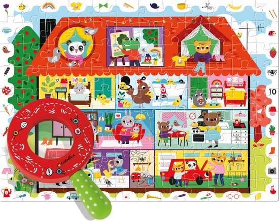 Ludattica Puzzels: DETECTIVE PUZZEL MIJN HUIS, 22,5×22,5x9cm, 108-delig, 50x70cm, met houten vergrootglas, 5+