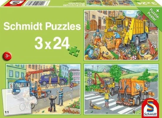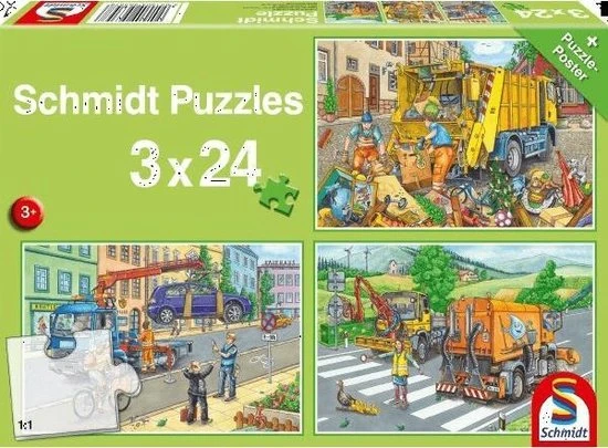 Schmidt Puzzel Vuilniswagen, Sleepwagen, Schoonmaakauto – 3 X 24 Stukjes – 3+