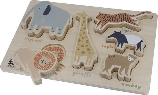 De stevige puzzelstukjes van de dierenpuzzel van het Deense merk Sebra hebben de vorm van zes wilde dieren: de olifant Finley, de leeuw Lee, de giraf Glenn, de tijger Tupi, de tapir-tip en de aap Maci. Al deze motieven worden ook afgedrukt op het bijbehorende puzzelbord. Laat het kind uitproberen hoe de stukjes met de mooie dieren in de verzonken gaten passen. Heerlijk spelen met deze mooie houten puzzel en ondertussen ontwikkeld uw kind zijn motoriek.