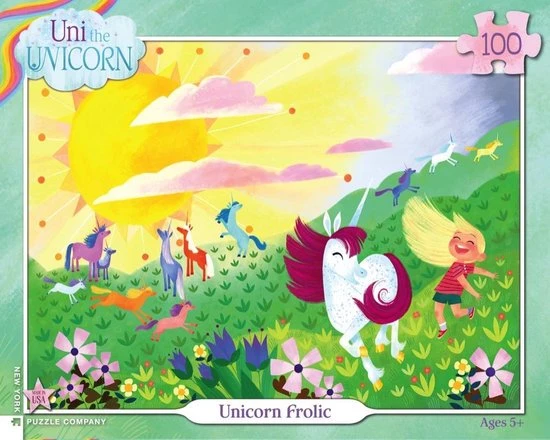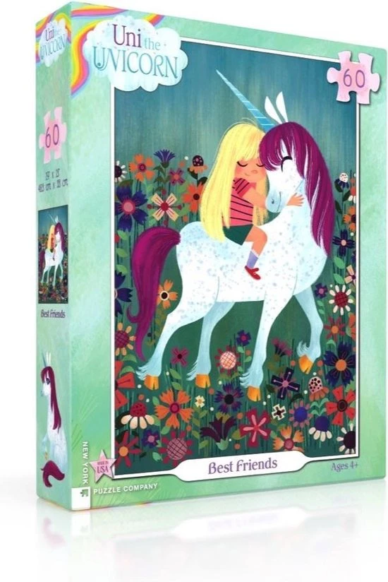 Galopperend door een veld met wilde bloemen zijn Uni de Eenhoorn en het kleine meisje beste vrienden. Bovenop Uni’s rug knuffelen de vriendjes en genieten ze van hun speciale vriendschap.