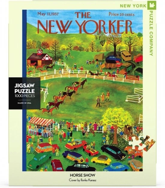 Wanneer je deze puzzel van New York Puzzle Company af hebt, kun je zien hoe de toeschouwers onder een strak blauwe lucht vanaf de zijlijn toekijken naar de ruiters en hun paarden. De juryleden staan centraal op de paardenshow, terwijl ze zich voorbereiden om de prijzen uit te reiken. De puzzel heeft 1000 stukjes en heeft een linnen stijl afwerking zodat de puzzel minder glimt. Aanbevolen leeftijd: 13+ jaar.