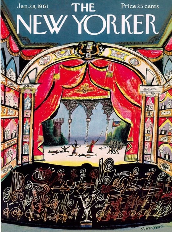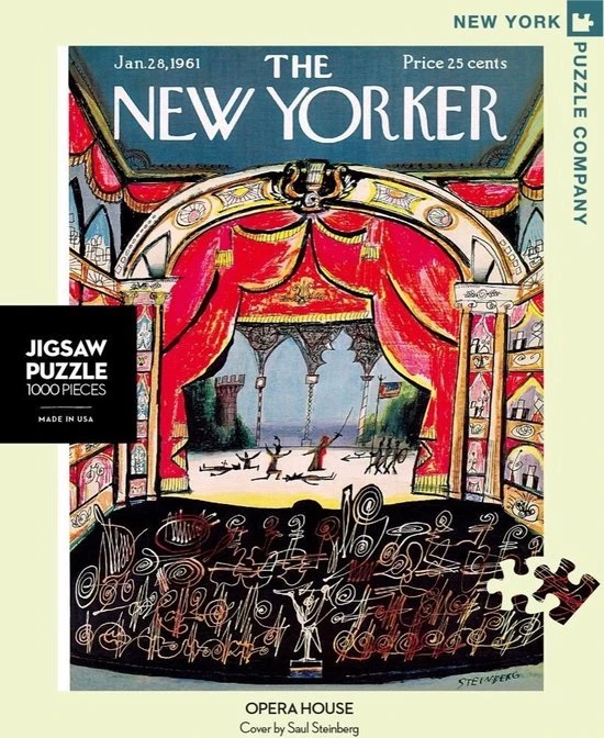 De omslagen van de New Yorker hebben de lezers van het tijdschrift bijna een eeuw lang vermaakt. Met ongeëvenaarde visuele verfijning en humor laten ze geen enkel onderwerp aan zich voorbij gaan. Een reeks buitengewone kunstenaars blijft onuitwisbare beelden creëren die oneindig gevarieerd zijn in stijl en toon, of het nu grillig, provocerend, sereen of grappig is. Deze New Yorker cover is ontworpen door kunstenaar Saul Steinberg, gepubliceerd in 1961.