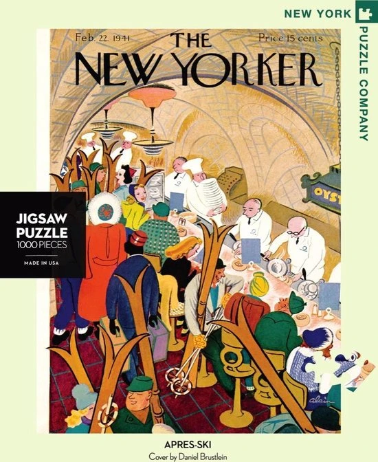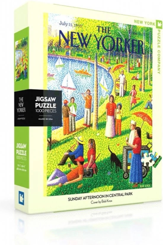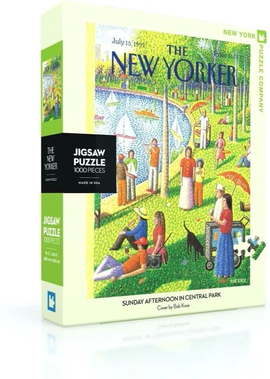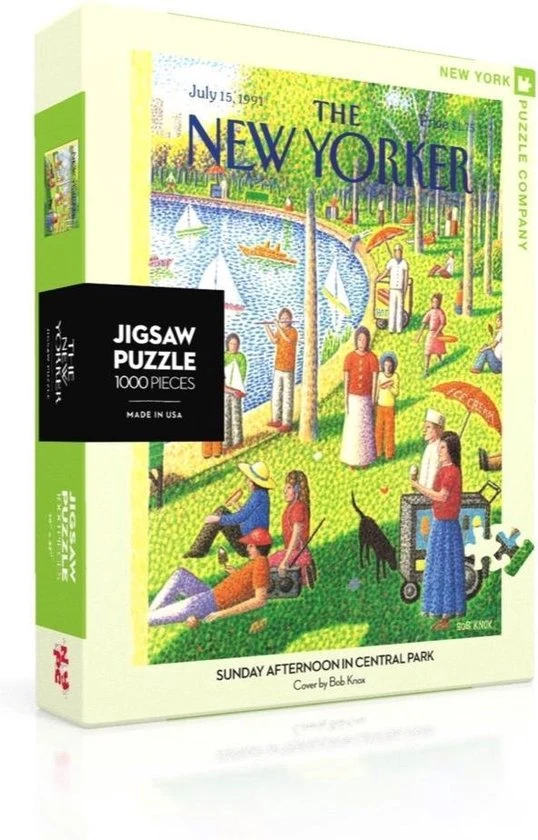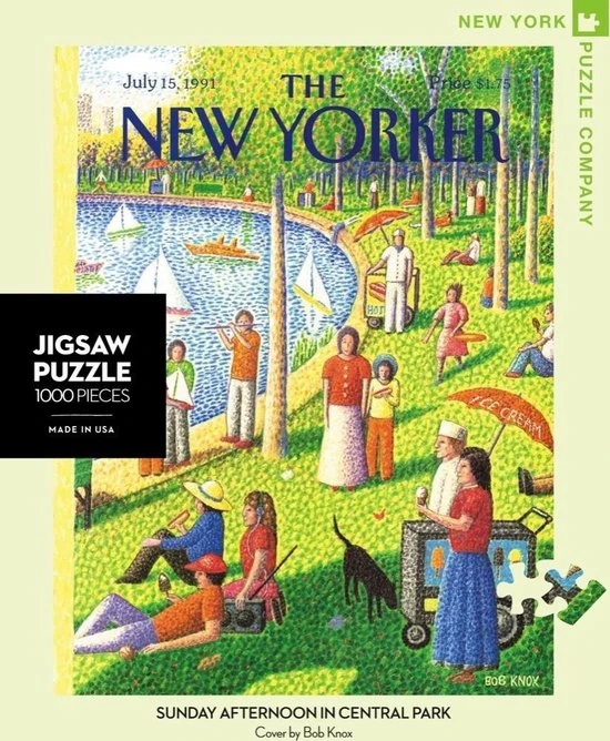 De omslagen van de New Yorker hebben de lezers van het tijdschrift bijna een eeuw lang vermaakt. Met ongeëvenaarde visuele verfijning en humor laten ze geen enkel onderwerp aan zich voorbij gaan. Een reeks buitengewone kunstenaars blijft onuitwisbare beelden creëren die oneindig gevarieerd zijn in stijl en toon, of het nu grillig, provocerend, sereen of grappig is. Deze New Yorker cover is ontworpen door kunstenaar Box Knox, gepubliceerd in 1991. De puzzel heeft 1000 stukjes en heeft een linnen stijl afwerking zodat de puzzel minder glimt. Aanbevolen leeftijd: 13+ jaar.