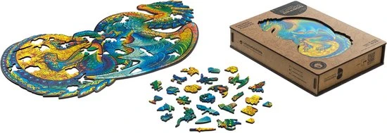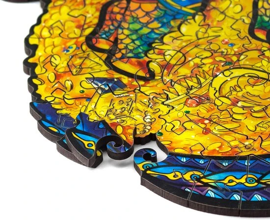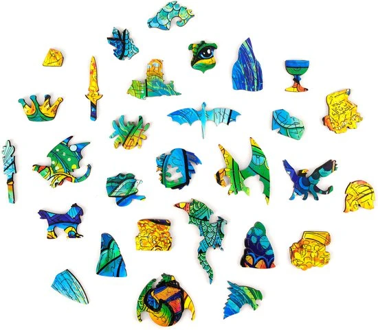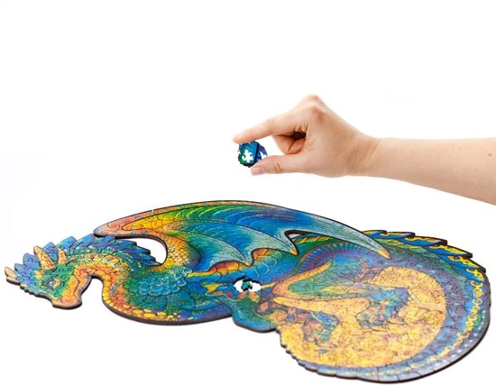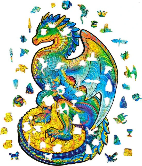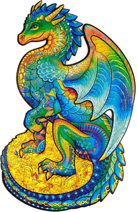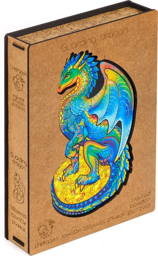 De houten puzzels van UNIDRAGON zijn een geweldig cadeau voor praktisch iedereen! Ben je klaar voor een magische uitdaging? Weet jij wat voor wonderbaarlijk beest zich in die enorme grot verbergt? Het is de beschermende draak. Er zijn veel geheimen en schatten in de grot. Veel winstbeluste mensen hebben hun zwaarden, speren, schilden en wapenrustingen neergelegd en hun rijkdom vergroot. Alleen de eigenaar van een zuiver hart en een heldere geest kan communiceren met dit sluwe beest en antwoorden vinden op alle vragen. Elk puzzelstuk is uniek wat de puzzeltijd nog leuker en plezieriger maakt. Kijk goed om je heen: er zijn diamanten, kisten met munten, ringen en gouden schalen. En er zijn ook andere kleine draken. Word jij een vriend van de beschermende draak?