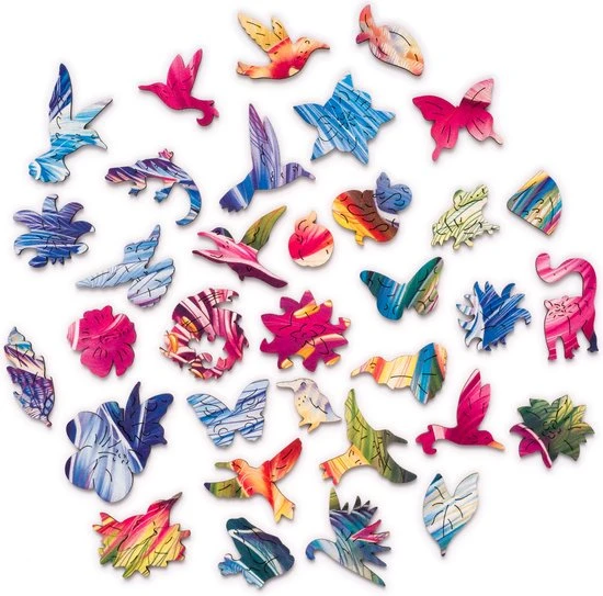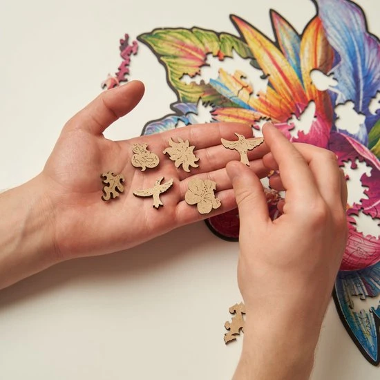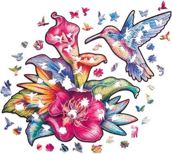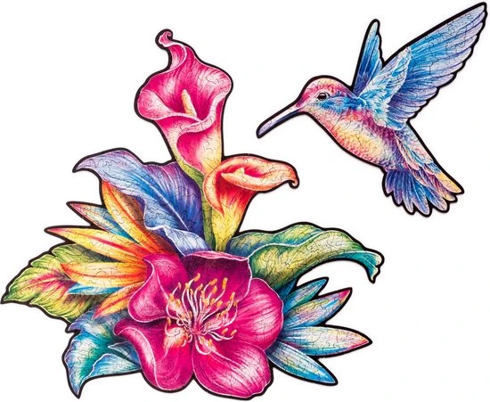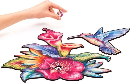 Je zult je nooit meer vervelen met deze houten puzzel van UNIDRAGON met een artwork van een kolibri aan een bloem. Elk stuk is uniek. Er zijn vormen van vlinders, bloemen en vogels die je meenemen naar een echt tropisch bos. Wanneer de puzzel helemaal compleet is, kun je hem inlijsten en als decoratie aan de muur hangen.