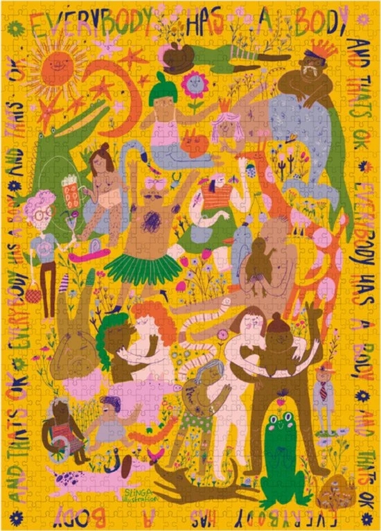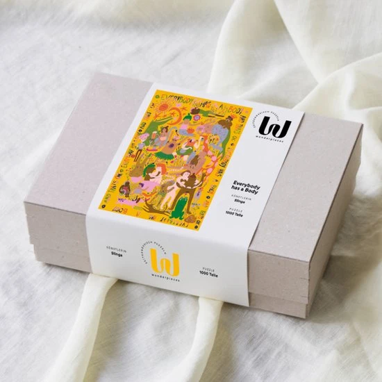 Met de Wonderpieces Legpuzzel Everybody Has a Body – 1000 stukjes heb je een bijzondere en mooie puzzel om te maken. De legpuzzels van Wonderpieces zijn stuk voor stuk van bijzondere afbeeldingen van jonge illustrators uit Duitsland gemaakt. Deze duurzaam gemaakte puzzel, genaamd Everybody Has a Body bestaat uit 1000 stukjes en is 68 x 48 centimeter. De puzzel is verpakt in plastic vrije verpakking van 100 procent gerecycled papier en een Fairtrade katoenen zak. Inclusief verpakking weegt de puzzel 800 gram.